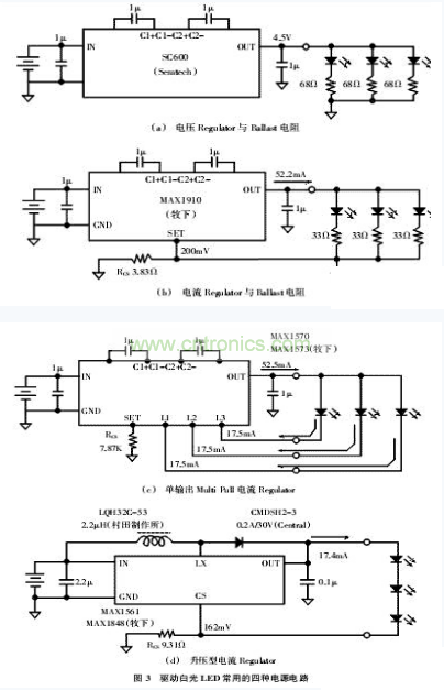 圖3是驅動白光LED常用的四種電源電路;圖4是上述六種隨機取樣白光LED穩定后的ReguLation精度特性。