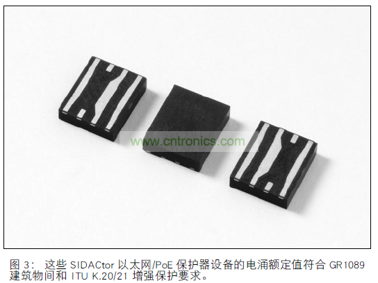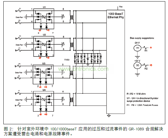 數(shù)據(jù)對導線中的保險絲提供必要的過流保護,對一級 GR-1089 事件的雷擊引起的過壓電涌不敏感。 雙向半導體晶閘管電涌保護設(shè)備 IC1 至 IC4 或 SIDACtor設(shè)備(參見圖3.)提供過壓消弧保護方法,根據(jù) GR-1089 第 6 版,這種方法符合一級和二級雷擊電涌。