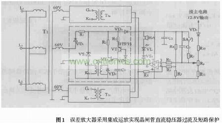 在擯棄電流采樣、放大和執行等多個環節的情況下,將單結晶體管移相觸發器中的晶體管誤差放大器改為集成運算放大器,就可實現晶閘管直流穩壓器的過流及短路保護,簡化了電路結構,并提高了整機的穩定可靠性能和AC - DC變換效率。