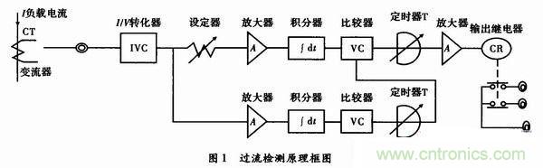過流檢測傳感器的工作原理如圖1所示。通過變流器所獲得的變流器次級電流經(jīng)I/V轉(zhuǎn)換成電壓,該電壓直流化后,由電壓比較器與設定值相比較,若直流電壓大于設定值,則發(fā)出辨別信號。但是這種檢測傳感器一般多用于監(jiān)視感應電源的負載電流,為此需采取如下措施。由于感應電源啟動時,啟動電流為額定值的數(shù)倍,與啟動結束時的電流相比大得多,所以在單純監(jiān)視電流電瓶的情況下,感應電源啟動時應得到必要的輸出信號,必須用定時器設定禁止時間,使感應電源啟動結束前不輸出不必要的信號,定時結束后,轉(zhuǎn)入預定的監(jiān)視狀態(tài)。