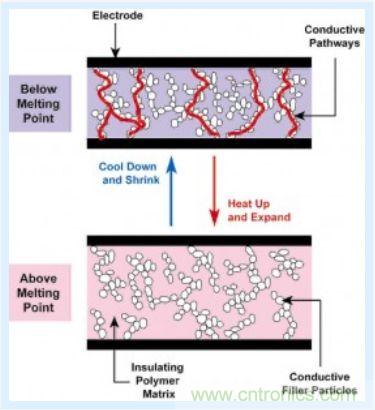 這是 PPTC 器件的工作原理,PPTC 器件是由一個由專業配方塑料和導電粒子混合而成的導電聚合物,如下圖所示,在正常溫度下,PPTC 器件中的導電粒子在聚合物中形成了低阻抗鏈。然而,如果溫度上升到器件的開關溫度之上,聚合物中的微晶體就會熔化而成為無定形狀態。晶體熔化過程中,體積會增加,引起導電粒子的分離,從而導致器件電阻呈現非線性增加。