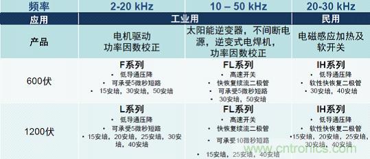 安森美半導體提供完善的IGBT產品系列,可以根據頻率、應用和電壓進行分類 (表1),不同產品有不同的特性和應用范圍。