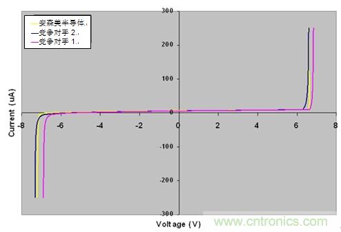 當對以上器件的DC性能進行比較的時候,結果看起來似乎是相同的(參見圖2所示曲線)。此外,它們都聲稱符合IEC61000-4-2第4級標準,這就意味 著它們將都經受住高達8 kV接觸電壓的ESD沖擊。確保保護敏感IC的ESD保護器件至關重要的性能不是DC性能; 盡管器件符合IEC61000-4-2的第4級標準是重要,但更重要的是保護IC。為確保在ESD事件期間IC沒有被損壞,保護二極管必須把ESD電壓鉗 位至足夠低的值,使IC不會損壞。
