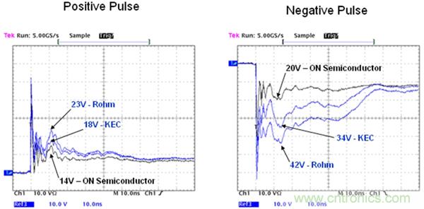 為了比較每個器件的鉗位性能,利用示波器來截取ESD發生期間的電壓波形。利用完全相同的測試條件,對上述器件進行并排測試。圖3中顯示出每個二極管對正/負ESD脈沖的響應曲線。所用的輸入脈沖為IEC61000-4-2第4級的標準接觸電壓(8 kV)。