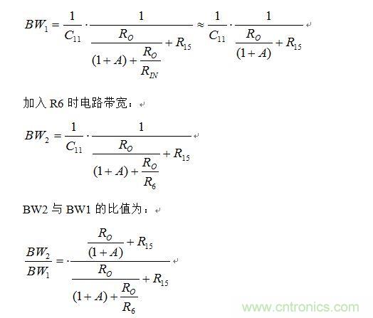 從上式看出,當(dāng)A較小時(shí),R6的加入確實(shí)有擴(kuò)展帶寬的作用,但R6的取值不能太大。當(dāng)R6取得很大時(shí),x=R0/R6趨近于0,BW2/BW1趨近于1,也就不能擴(kuò)展帶寬了。