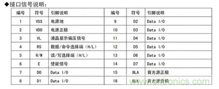 我們首先來看1602的引腳定義,1602的引腳是很整齊的SIP單列直插封裝,所以器件手冊(cè)只給出了引腳的功能數(shù)據(jù)表: