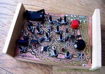 接著是跟前面的街頭涂鴉風(fēng)格完全不同的另一款迷你合成器電路板;電路板上并列的那一排骷髏是合成器的鍵盤,振蕩器(oscillator)的間距是由皮膚接觸的電平來控制。事實(shí)上,玩這個小東西的秘訣是,在開始彈奏之前先舔一舔(?!)指尖…