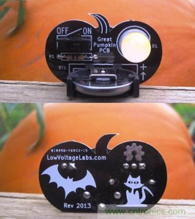 這是low voltage labs開發(fā)的南瓜PCB,除了形狀很可愛,還印了可愛的圖案;這款電路板上面有LED燈泡,就是讓你在萬圣節(jié)放進(jìn)南瓜燈,不必?fù)?dān)心蠟燭會被風(fēng)吹熄….其實(shí)直接當(dāng)成擺飾也很有味道,而且只要6美元就買得到!