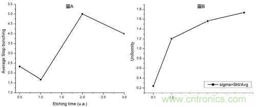 圖4.圖A為階褶數(shù)量與蝕刻時間的關(guān)系。圖B表面均勻度與蝕刻時間的關(guān)系。