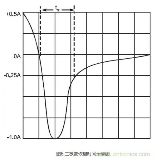 如圖6所示,二極管的反向恢復時間為電流通過零點由正向轉換成反向,再由反向轉換到規定低值的時間間隔,實際上是釋放二極管在正向導通期間向PN結的擴散電容中儲存的電荷。反向恢復時間決定了二極管能在多高頻率的連續脈沖下做開關使用,如果反向脈沖的持續時間比反向恢復時間短,則二極管在正向、反向均可導通就起不到開關的作用。PN結中儲存的電荷量與反向電壓共同決定了反向恢復時間,而在高頻脈沖下不但會使其損耗加重,也會引起較大的電磁干擾。所以知道二極管的反向恢復時間正確選擇二極管和合理設計電路是必要的,選擇二極管時應盡量選擇PN結電容小、反向恢復時間短的,但大多數廠家都不提供該參數數據。