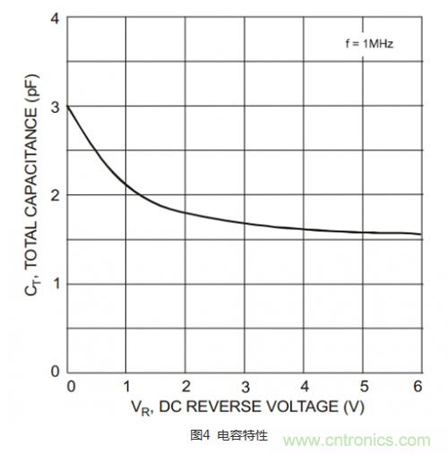 首先,我們熟悉下二極管的電容特性:圖4所示的是IN4448HWS二極管的電容特性。零反向偏壓下,電容是3pF,隨著反向偏壓越來越大,結電容越來越小。