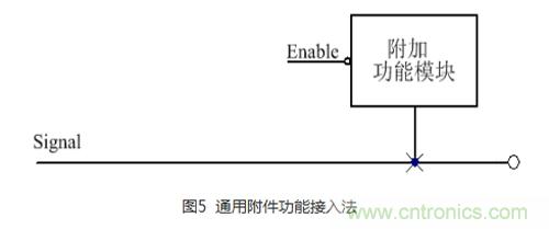 在高速信號線上,通常會附加一些功能,這些功能通常會帶來不利的影響,如會產生很大的寄生電容,這個電容視具體的電路模塊而定。如果忽略這個電容,可能會影響這個信號的頻率。最不幸的是,就算您注意到了這個電容,由于附加的功能模塊產生的電容太大,似乎也無能為力。通用附件功能接入法如圖5所示: