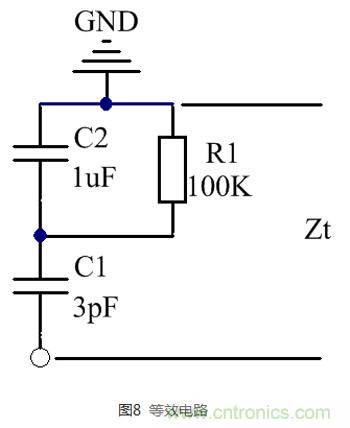 不管正向還是反向接入法,其等效電路都如圖8所示。我們假設二極管的節電容為3pF,附件功能模塊寄生總電容1uF。如果電阻足夠大,那么可以忽略,此時就是兩個電容串聯,和電阻并聯類似,CT=C1*C2/(C1+C2)≈C1(C2較大)。大電容就算變化很大,串聯總電容幾乎等于小電容,即3pF,有效減小接入電容。