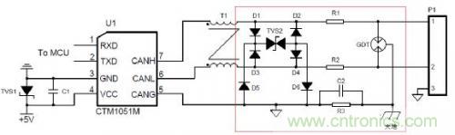 增加隔離后,是否萬(wàn)事大吉了?肯定不是,隔離只是阻擋,如果干擾強(qiáng)度很高,比如達(dá)到2KV浪涌,隔離也會(huì)被破壞。所以要想達(dá)到更高的防護(hù)等級(jí),必須增加防浪涌電路。如圖6所示,為致遠(yuǎn)電子高速總線標(biāo)準(zhǔn)防浪涌保護(hù)電路。