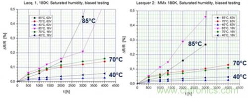 圖 4 顯示了采用“漆 1”涂層的高阻值薄膜電阻器(MELF MMA0204,180 kΩ)的性能。