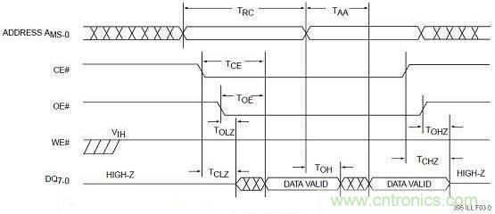 從圖中我們可以看出ADDRESS是表示地址總線的,DQ是表示數據總線的,CE是片選信號,且是低電平有效,其寬度要保證在進行讀操作時總是有效的。學會看時序圖對于做嵌入式系統開發非常有幫助,因為我們不可避免的要與芯片打交道。在時序圖中,通常會標識很多的時間需求信息。在寫啟動代碼時需要初始化各地址空間的片選地址寄存器和讀寫時序,時序的配置依據就是來自于外設芯片的時間需求,這是芯片手冊很重要的一部分內容。當一個地址空間中存在多個外設芯片時,我們需要考慮到其中最慢的外設芯片的時間需求,否則的話有的芯片就不能正常工作。