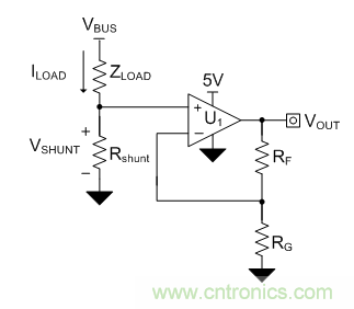 在設計低側電流感應電路時,高性價比的方法之一是使用非反相配置運算放大器(op amp)。圖1是使用運算放大器的典型低側電流感應電路原理圖。