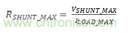 計算最大分流電阻。當來自負載(ILOAD)的電流流過分流電阻器(RSHUNT)時,分流電阻器上會形成一個電壓電位(VSHUNT)。VSHUNT被視為系統負載的“接地端”。因此,建議將VSHUN的最大負載電流保持在100mV以下,以避免在與其它具有真正0V接地的系統連接時出現問題。公式2用于計算RSHUNT值: