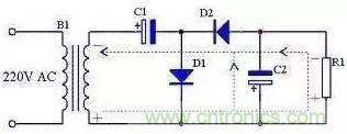 前面介紹的三種整流電路輸出電壓都小于輸入交流電壓的有效值,如果需要輸出電壓大于輸入交流電壓有效值時可以采用倍壓電路,見圖12。由圖13可知,在電源的正半周,變壓器B1次級上端為正下端為負,D1導通,D2截止,C1通過D1充電,充電后C1兩端電壓接近B1次級電壓峰值,方向為左端正右端負;由圖14可知,在電源的負半周,變壓器B1次級上端為負下端為正,D1截止,D2導通,C2通過D1充電,充電后C2兩端電壓接近C1兩端電壓與B1次級電壓峰值之和,方向為下端正上端負。由于負載R1與C1并聯,當R1足夠大時,R1兩端的電壓即為接近2倍B1次級電壓。
