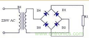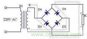 由于全波整流電路需要特制的變壓器,制作起來比較麻煩,于是出現了一種橋式整流電路。這種整流電路使用普通的變壓器,但是比全波整流多用了兩個整流二極管。由于四個整流二極管連接成電橋形式,所以稱這種整流電路為橋式整流電路。