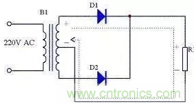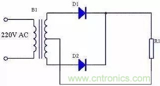 全波整流電路每個整流二極管上流過的電流只是負載電流的一半,比半波整流小一倍。