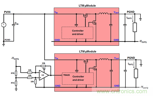 TRACK引腳輸入允許μModule穩(wěn)壓器通過將跟蹤信號(hào)(即,主μModule穩(wěn)壓器的輸出電壓軌的分壓版本)提供給從μModule穩(wěn)壓器的TRACK引腳來跟蹤另一電源軌的輸出電壓斜坡。每個(gè)μModule穩(wěn)壓器內(nèi)部控制器所看到的TRACK引腳電壓與其μModuleGND引腳相關(guān),但在需要配置兩個(gè)負(fù)輸出轉(zhuǎn)換器進(jìn)行跟蹤的應(yīng)用中,μModule穩(wěn)壓器的GND引腳可以處于不同的電位。主和從GND引腳電位差異意味著主設(shè)備提供的跟蹤信號(hào)不能直接施加到從設(shè)備的跟蹤引腳。在這些類型的應(yīng)用中,需要額外的考慮以確保從機(jī)相位能夠看到來自主機(jī)相位的正確參考的跟蹤信號(hào)。