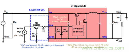 圖2.μModule穩(wěn)壓器的輸入信號(hào)必須從電源地電平轉(zhuǎn)換為-VOUT參考電平