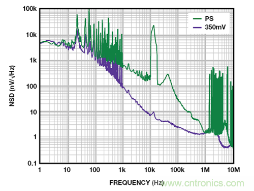 當(dāng)裕量為 350 mV 時,LDO 采用壓差工作模式。此時,LDO 再也不能調(diào)節(jié)輸出電壓,充當(dāng)一個電阻,輸出噪聲升至近 76 μVrms,如圖 9 所示。只有 FET 的 RDSON和輸出端的電容形成的極點(diǎn)衰減輸入噪聲。