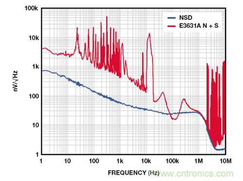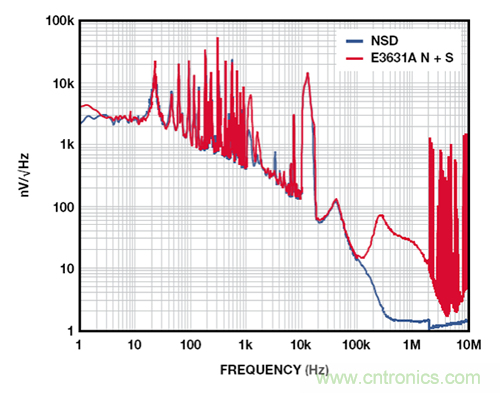 圖 4 展示的是 2.5 V ADM7160 在 500 mV 裕量和 100 mA 負(fù)載條件下,相對于 E3631A 臺式電源的輸出噪聲,該臺式電源在 20 Hz至 20 MHz 范圍內(nèi)的額定噪聲低于 350 μV-rms。1 kHz 以下的許多雜散為與 60 Hz 線路頻率整流相關(guān)的諧波。10 kHz 以上的寬雜散來自產(chǎn)生最終輸出電壓的 DC-DC 轉(zhuǎn)換器。1 MHz 以上的雜散源于環(huán)境中與電源噪聲不相關(guān)的 RF 源。在 10 Hz 至 100 kHz范圍內(nèi),這些測試所用電源的實(shí)測噪聲為 56 μV rms,含雜散為104 μV。LDO 抑制電源上的所有噪聲,輸出噪聲約為 9 μV-rms。