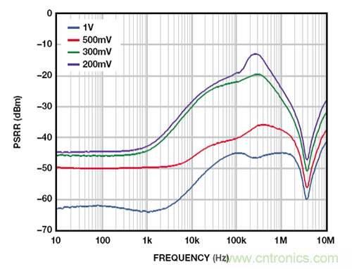 隨著裕量電壓的減小,PSRR 也會減小,壓差可能變得非常大。例如,在 100 kHz 下,裕量電壓從 1 V 變?yōu)?500 mV,結(jié)果將使PSRR 減少 5 dB。然而,裕量電壓的較小變化,從 500 mV 變?yōu)?00 mV,結(jié)果會導(dǎo)致 PSRR 下降 18 dB 以上。