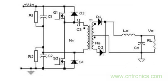 電容器C1和C2與開(kāi)關(guān)管Q1、Q2組成橋,橋的對(duì)角線接變壓器T1的原邊繞組,故稱半橋變換器。如果此時(shí)C1=C2,那么當(dāng)某一開(kāi)關(guān)管導(dǎo)通時(shí),繞組上的電壓只有電源電壓的一半。