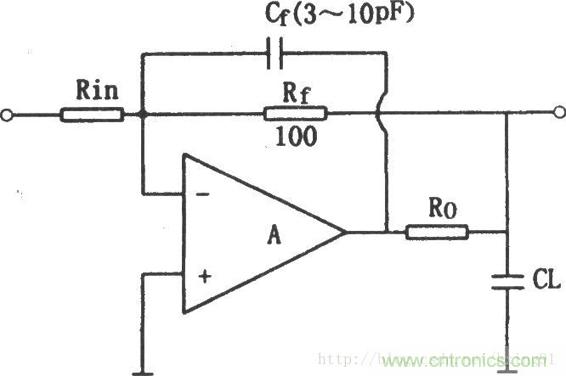 對(duì)于許多集成運(yùn)算放大電路,若輸出負(fù)載電容CL的值比100pF大很多,由于輸出電容(包括寄生電容)與輸出電阻將造成附加相移,這個(gè)附加相移的累加就可能產(chǎn)生寄生振蕩,使放大器工作嚴(yán)重不穩(wěn)定。解決這一問題的方法是在運(yùn)放的輸出端串聯(lián)一個(gè)電阻Ro,使負(fù)載電容CL與放大電路相隔離,如圖所示,在Ro的后面接反饋電阻Rf,這樣可以補(bǔ)償直流衰減,加反饋電容Cf會(huì)降低高頻閉環(huán)電壓放大倍數(shù),Cf的選取方法是:使放大電路在單位增益頻率fT時(shí)的容抗Xcf≤Rf/10,又Xf=l/(2πfTCf),一般情況下,Ro=50~200Ω,Cf約為3~10pF。