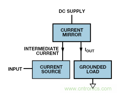 若電流或電壓輸入參考地,則必須使用電平轉換。有多個電路可以實現;而圖 8 中的系統在很多場合下都適用。這款簡單的電路采用接地電流源驅動直流電源上的電流鏡,從而驅動負載。注意,電流鏡可能有增益,因此信號電流不需要像負載電流那么高。