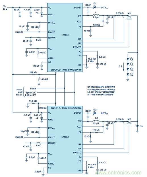 LT3932的專有閃光技術可以擴展,驅動器可以并聯以提供更高的LED閃光電流。所需的閃光形狀和完整性保持不變。圖1顯示了并聯兩個驅動器以支持3 A相機閃光燈是多么容易,高達4 A的設計也是可行的。