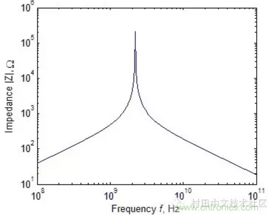 同樣可以得到一個典型的電容器的阻抗絕對值與頻率的關系。如下圖所示,由于存在介質損耗和有限長的引線,電容顯示出與電阻同樣的諧振特性。