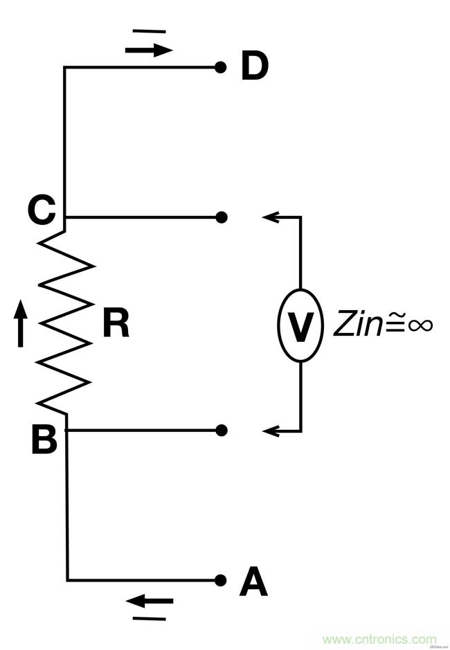 原則上借助電阻(“R”)和相應(yīng)的壓降(“V”,從B到C)來測量電流(I,從A到D)是非常簡單的,但是有一些細小的問題要承認,當電流很高而且電阻阻值為100 mΩ或者更低時我們要采用四線高阻抗開爾文感應(yīng)檢測法則。
