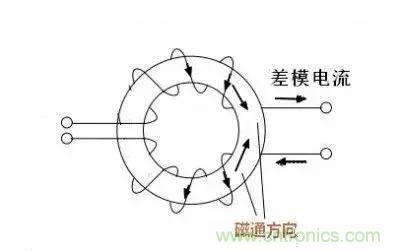 共模電感會飽和嗎?答案是非常難飽和,通常情況下無需擔心飽和問題,為什么呢?我們先來看看差模電流流過共模電感的情況。如圖,差模電流電流電感時其磁通是相互抵消的,也就是說,在磁路里基本沒有磁通產生,差模電流流過時沒有阻力,沒有損耗,簡單說,一個額定電流5A的共模電感流過100A的差模電流也不會飽和,當然前提是導線夠粗。
