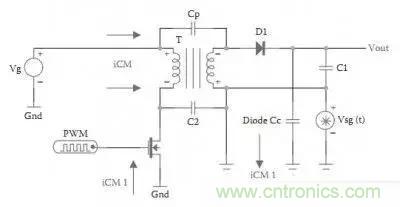 共模干擾由MOS管的高di/dt引起,經過變壓器間的電容Cp或雜散電容C2傳到副邊,以Cp為主,C2基本可忽略。我們知道Cp很小,因此能傳到副邊的干擾頻率一定很高,低頻干擾信號過不去,因此EMI測試中的高頻部分基本就是共模干擾。究竟多少MHz與變壓器的結構有很大的關系,層間電容大了則可能1MHz的共模能過去,層間電容小了,則只能是更高的頻率能過去,比如5MHz以上。