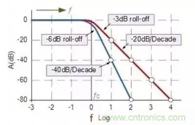 圖中橫坐標是頻率,用對數表示,縱坐標表示增益,單位為dB,注意圖中的圓點處,右面一條是一階濾波器的衰減曲線,圓點從1 到 2 頻率增加了十倍,從縱坐標中可以看到增益下降了20dB,通常稱為10倍頻程衰減20dB,左面一條曲線是二階濾波器,不難看出10倍頻程衰減40dB。