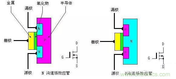 功率MOSFET的內(nèi)部結(jié)構(gòu)和電氣符號(hào)如圖所示,它可分為 NPN型和PNP型。NPN型通常稱(chēng)為N溝道型,PNP型通常稱(chēng)P溝道型。由圖1可看出,對(duì)于N溝道型的場(chǎng)效應(yīng)管其源極和漏極接在N型半導(dǎo)體上,同樣對(duì)于P 溝道的場(chǎng)效應(yīng)管其源極和漏極則接在P型半導(dǎo)體上。我們知道一般三極管是由輸入的電流控制輸出的電流。但對(duì)于場(chǎng)效應(yīng)管,其輸出電流是由輸入的電壓(或稱(chēng)場(chǎng)電壓)控制,可以認(rèn)為輸入電流極小或沒(méi)有輸入電流,這使得該器件有很高的輸入阻抗,同時(shí)這也是我們稱(chēng)之為場(chǎng)效應(yīng)管的原因。