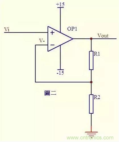 圖二中Vi與V-虛短,則 Vi = V- ……a 因為虛斷,反向輸入端沒有電流輸入輸出,通過R1和R2 的電流相等,設(shè)此電流為I,由歐姆定律得: I = Vout/(R1+R2) ……b Vi等于R2上的分壓, 即:Vi = I*R2 ……c 由abc式得Vout=Vi*(R1+R2)/R2 這就是傳說中的同向放大器的公式了。