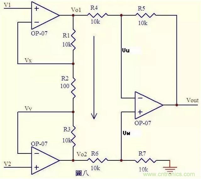圖八.由虛短知 Vx = V1 ……a Vy = V2 ……b 由虛斷知,運放輸入端沒有電流流過,則R1、R2、R3可視為串聯(lián),通過每一個電阻的電流是相同的, 電流I=(Vx-Vy)/R2 ……c 則: Vo1-Vo2=I*(R1+R2+R3) = (Vx-Vy)(R1+R2+R3)/R2 ……d 由虛斷知,流過R6與流過R7的電流相等,若R6=R7, 則Vw = Vo2/2 ……e 同理若R4=R5,則Vout – Vu = Vu – Vo1,故Vu = (Vout+Vo1)/2 ……f 由虛短知,Vu = Vw ……g 由efg得 Vout = Vo2 – Vo1 ……h 由dh得 Vout = (Vy –Vx)(R1+R2+R3)/R2 上式中(R1+R2+R3)/R2是定值,此值確定了差值(Vy –Vx)的放大倍數(shù)。 這個電路就是傳說中的差分放大電路了。