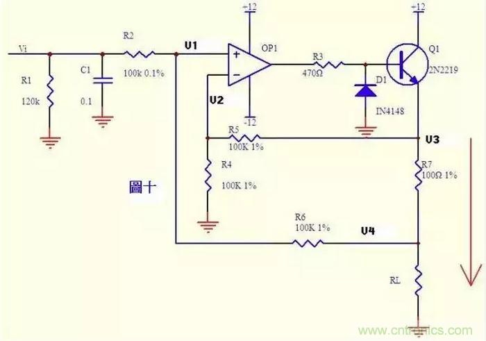 電流可以轉(zhuǎn)換成電壓,電壓也可以轉(zhuǎn)換成電流。圖十就是這樣一個電路。上圖的負反饋沒有通過電阻直接反饋,而是串聯(lián)了三極管Q1的發(fā)射結(jié),大家可不要以為是一個比較器就是了。只要是放大電路,虛短虛斷的規(guī)律仍然是符合的!