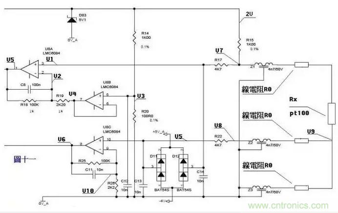 來一個復雜的,圖十一是一個三線制PT100前置放大電路。PT100傳感器引出三根材質(zhì)、線徑、長度完全相同的線,接法如圖所示。有2V的電壓加在由R14、R20、R15、Z1、PT100及其線電阻組成的橋電路上。Z1、Z2、Z3、D11、D12、D83及各電容在電路中起濾波和保護作用,靜態(tài)分析時可不予理會,Z1、Z2、Z3可視為短路,D11、D12、D83及各電容可視為開路。 由電阻分壓知, V3=2*R20/(R14+20)=200/1100=2/11 ……a 由虛短知,U8B第6、7腳 電壓和第5腳電壓相等 V4=V3 ……b 由虛斷知,U8A第2腳沒有電流流過,則流過R18和R19上的電流相等。 (V2-V4)/R19=(V5-V2)/R18 ……c 由虛斷知,U8A第3腳沒有電流流過, V1=V7 ……d 在橋電路中R15和Z1、PT100及線電阻串聯(lián),PT100與線電阻串聯(lián)分得的電壓通過電阻R17加至U8A的第3腳, V7=2*(Rx+2R0)/(R15+Rx+2R0) …..e 由虛短知,U8A第3腳和第2腳電壓相等, V1=V2 ……f 由abcdef得, (V5-V7)/100=(V7-V3)/2.2 化簡得 V5=(102.2*V7-100V3)/2.2 即 V5=204.4(Rx+2R0)/(1000+Rx+2R0) – 200/11 ……g 上式輸出電壓V5是Rx的函數(shù) 我們再看線電阻的影響。Pt100最下端線電阻上產(chǎn)生的電壓降經(jīng)過中間的線電阻、Z2、R22,加至U8C的第10腳,由虛斷知, V5=V8=V9=2*R0/(R15+Rx+2R0) ……a (V6-V10)/R25=V10/R26 ……b 由虛短知, V10=V5 ……c 由式abc得 V6=(102.2/2.2)V5=204.4R0/[2.2(1000+Rx+2R0)] ……h 由式gh組成的方程組知,如果測出V5、V6的值,就可算出Rx及R0,知道Rx,查pt100分度表就知道溫度的大小了。