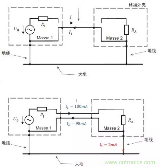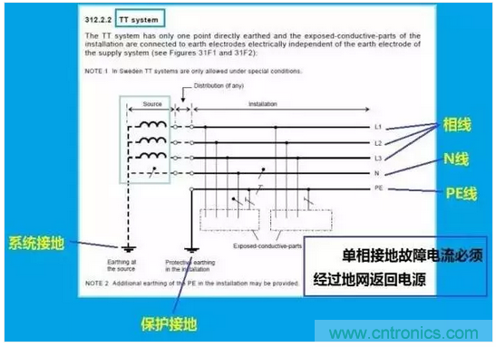知曉這幾個概念后,我們來看看IEC給出的有關(guān)TN-C和TT系統(tǒng)的原圖。注意,這兩幅圖是不容置疑的,是有關(guān)接地系統(tǒng)的權(quán)威解釋。