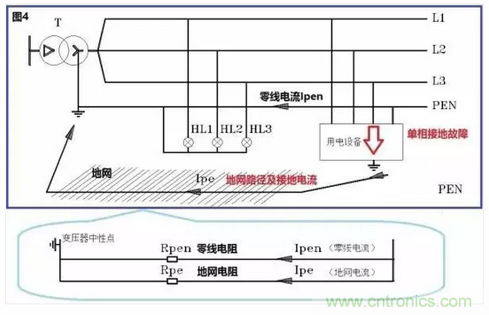 我們看圖4的下圖,我們發(fā)現(xiàn)當(dāng)L3相對用電設(shè)備的外殼短路時,保護(hù)性中性線中有電流流過,地網(wǎng)中也有電流流過。