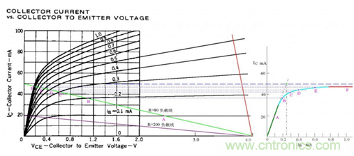 這里理解起來有些抽象,那我就具體的畫個圖,就很好理解了。在三極管截止的時候CE兩端的電壓是最大的,我們設為4.5V,在IB逐漸加大的過程中,VCE在逐漸變小,而飽和狀態(tài)下的Ic是由RC決定的,請看圖: