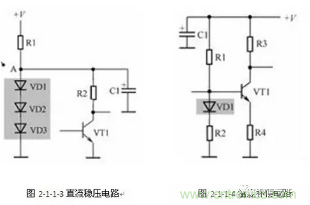 二極管簡易穩壓電路中主要利用二極管的管壓降基本不變特性。二極管的管壓降特性:二極管導通后其管壓降基本不變,對硅二極管而言這一管壓降是0.6V左右,對鍺二極管而言是0.2V左右。上圖所示是由普通3只二極管構成的簡易直流穩壓電路。電路中的VD1、VD2和VD3是普通二極管,它們串聯起來后構成一個簡易直流電壓穩壓電路。圖2-1-1-3.