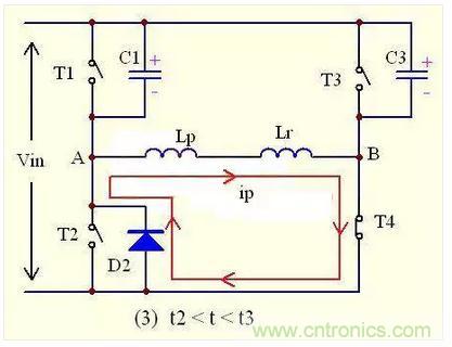 如上圖,此時T2與T3同時導通,T1與T4同時關斷,原邊電流ip的流向是T3—Lk—Lp—T2,如圖所示。