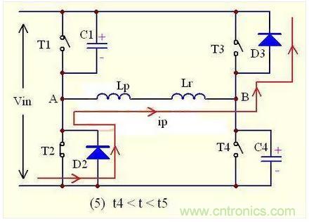 如圖所示,在t5時刻之前,T3已經導通,在t5時刻原邊電流ip已經下降到0,由于沒有了電流,所以D2,D3自然關斷。